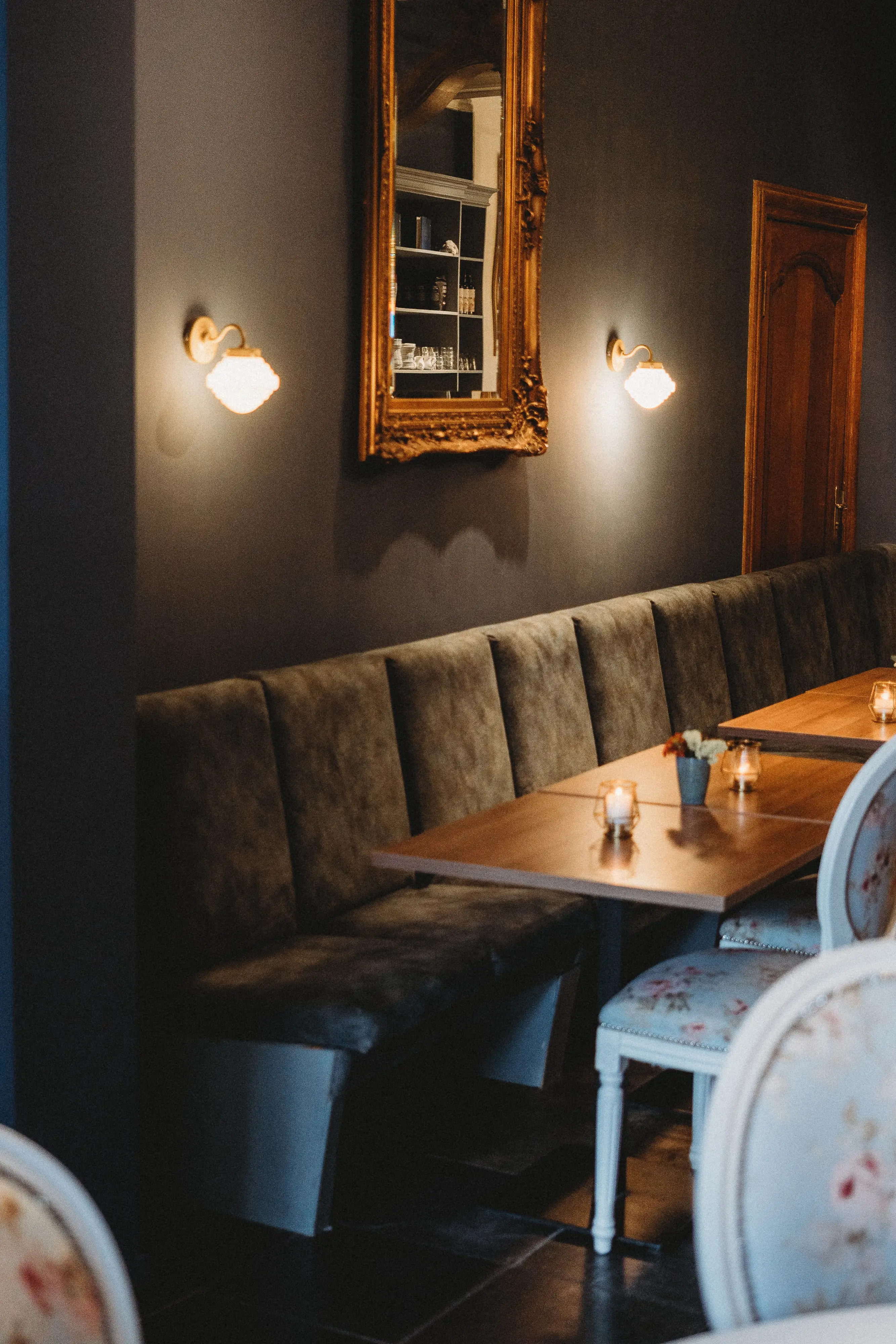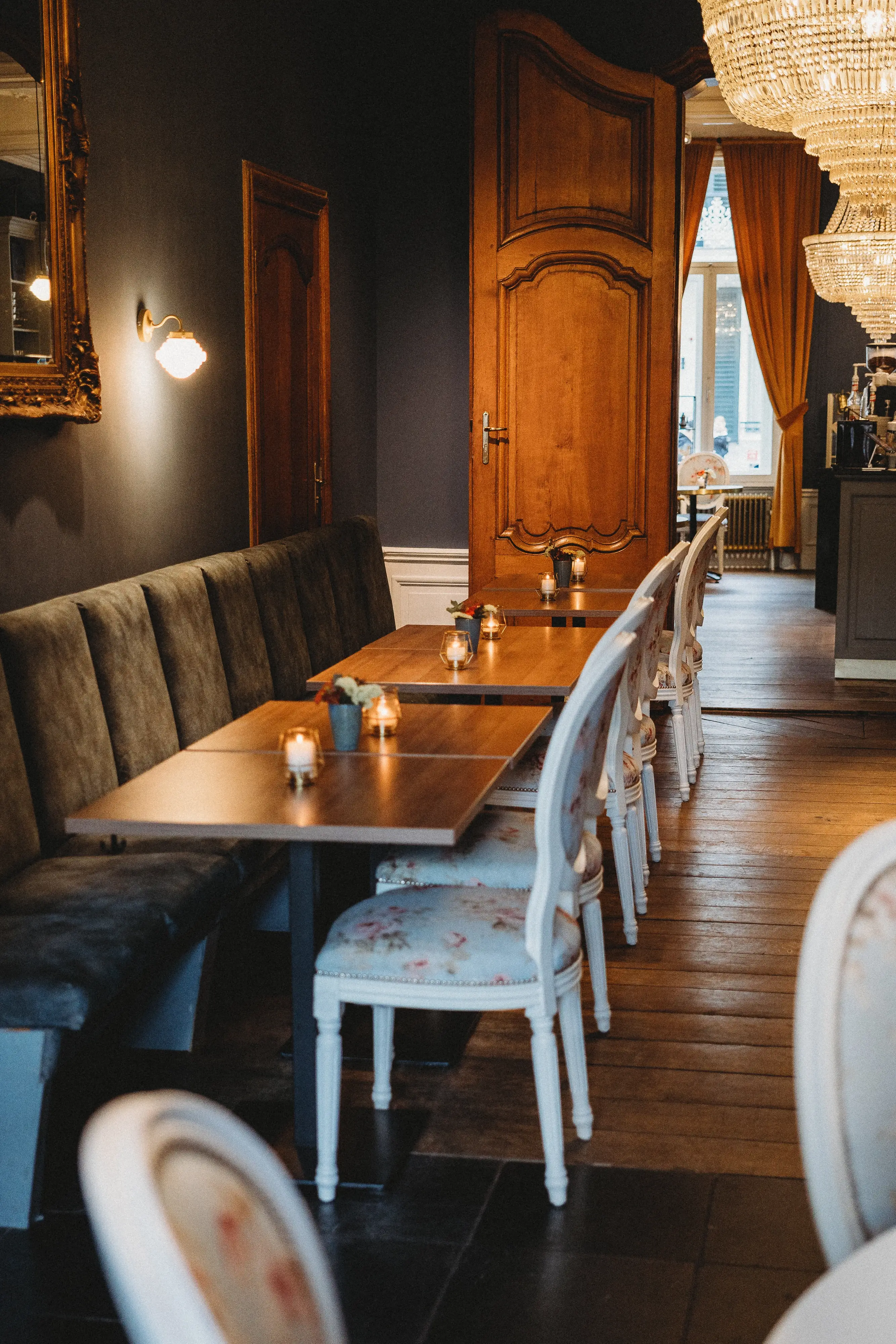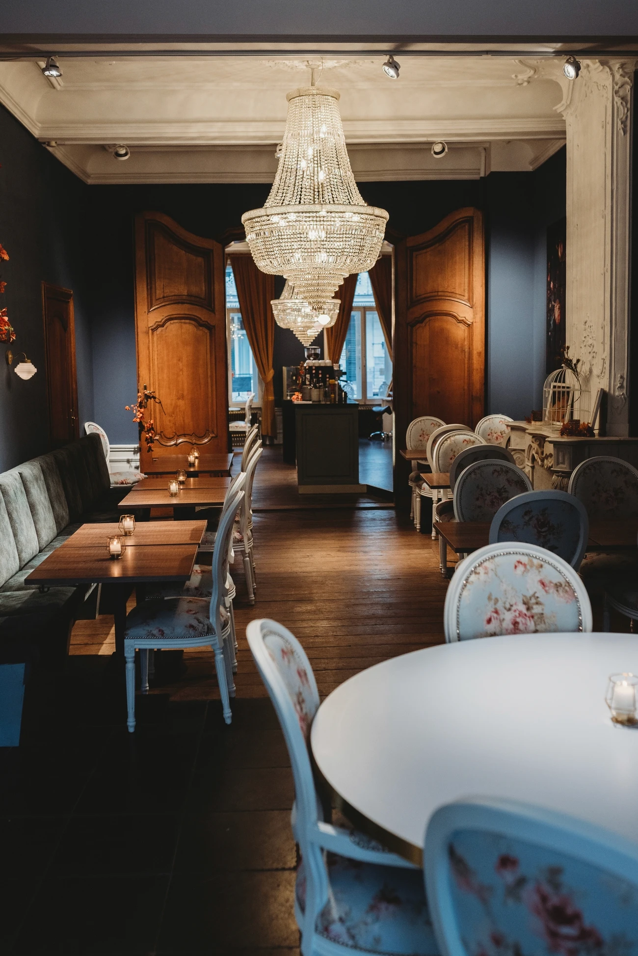 Authentieke elementen van het monumentale pand, zoals plafondornamenten, marmeren schouwen en originele houten vloeren, werden gecombineerd met moderne details zoals gouden radiatoren. Deze harmonieuze mix resulteerde in een warme, huiselijke sfeer waar gasten zich meteen thuis voelen en kunnen genieten van ontbijt, lunch en heerlijke zoetigheden.