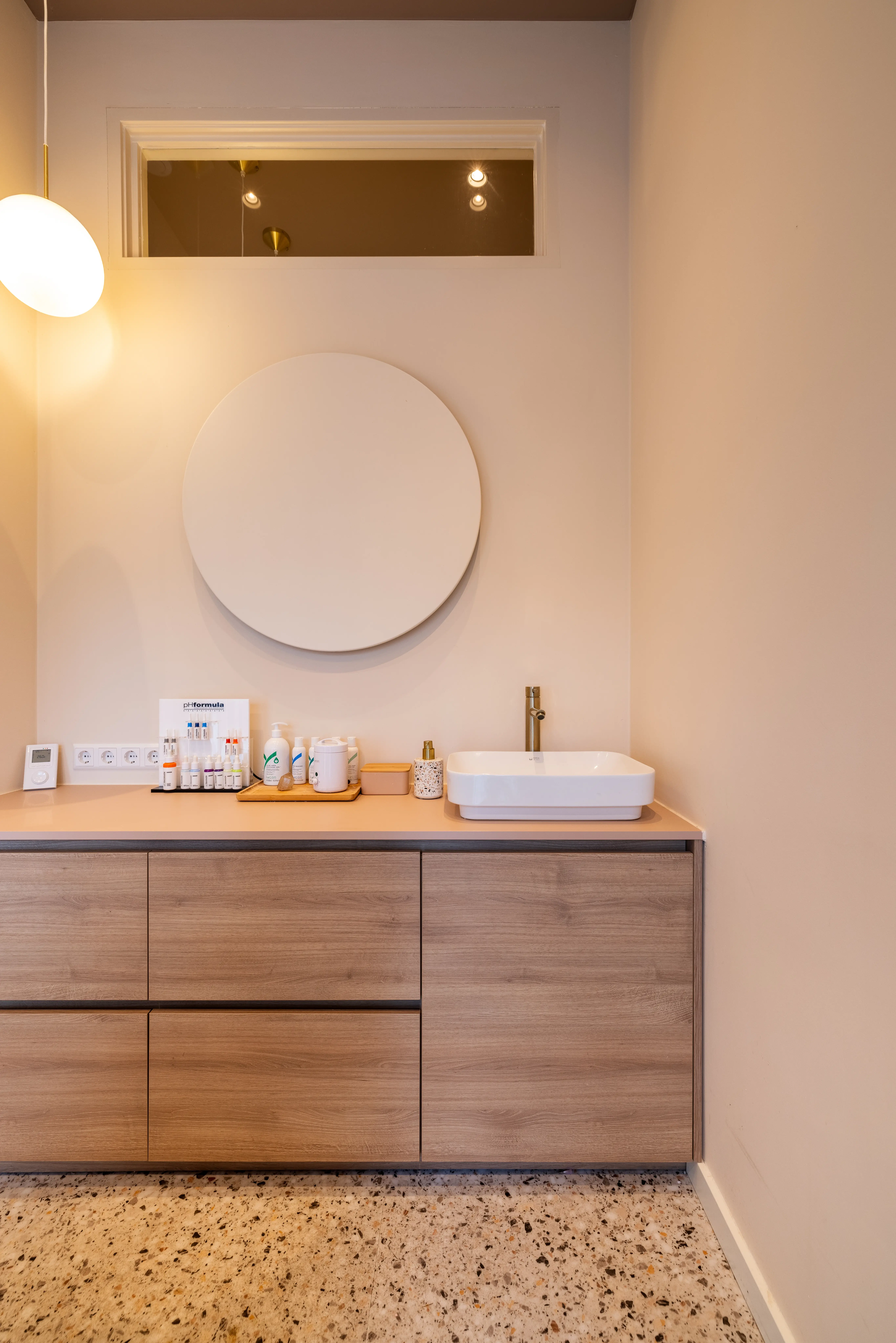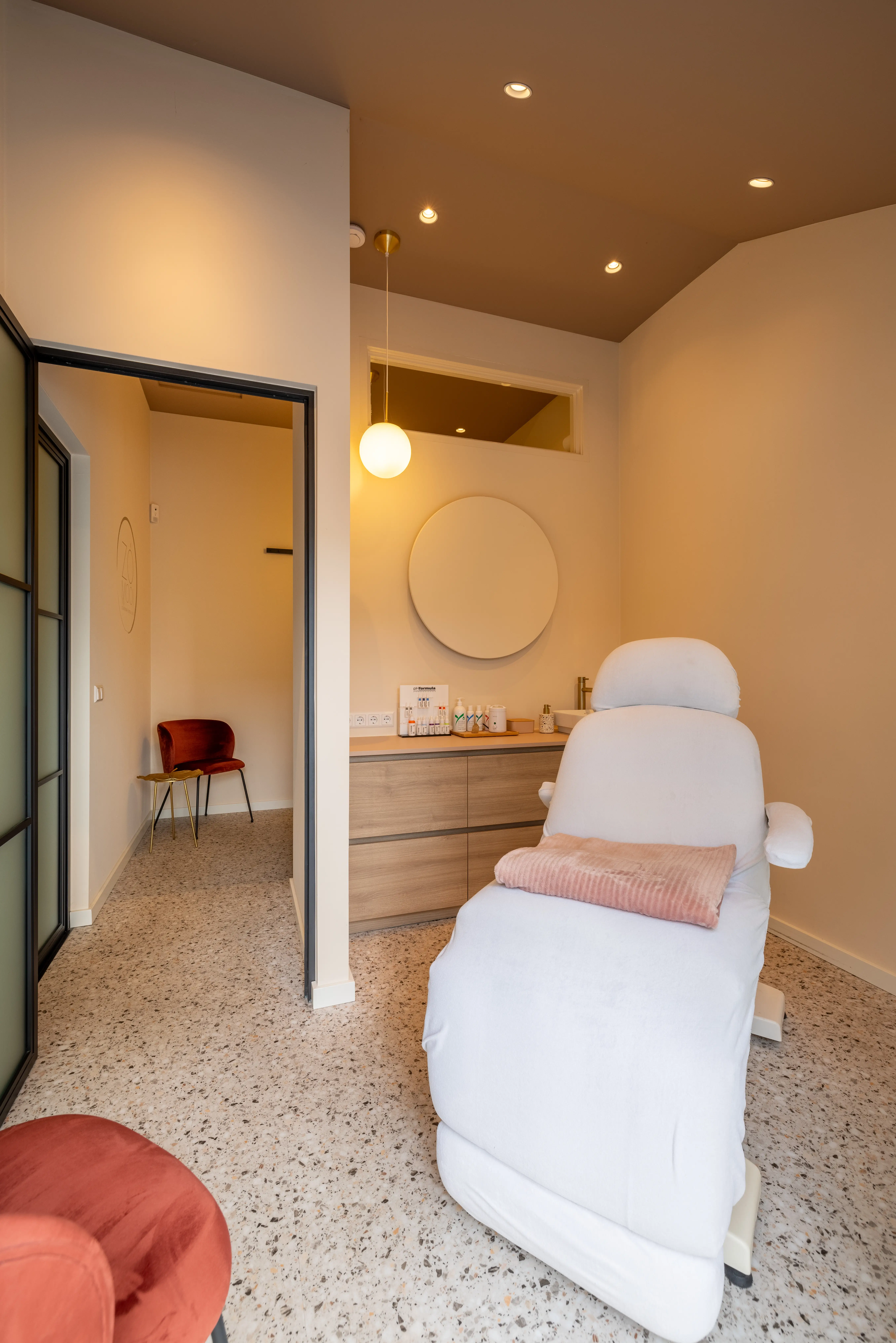Een slimme transformatie van garage en kelder naar een luxe schoonheidssalon met een duidelijke scheiding tussen werk en privé.