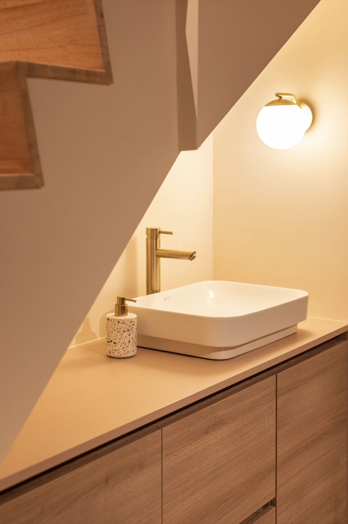 Tijdens het ontwerpproces ontdekten we dat de garage direct boven de kelder lag, waardoor we beide ruimtes konden verbinden met een trap. De garagepoort werd vervangen door een schuifpui om veel daglicht binnen te laten. Op de begane grond creëerden we een ontvangstruimte en een behandelkamer, en via de trap bereik je een tweede behandelkamer in de kelder.