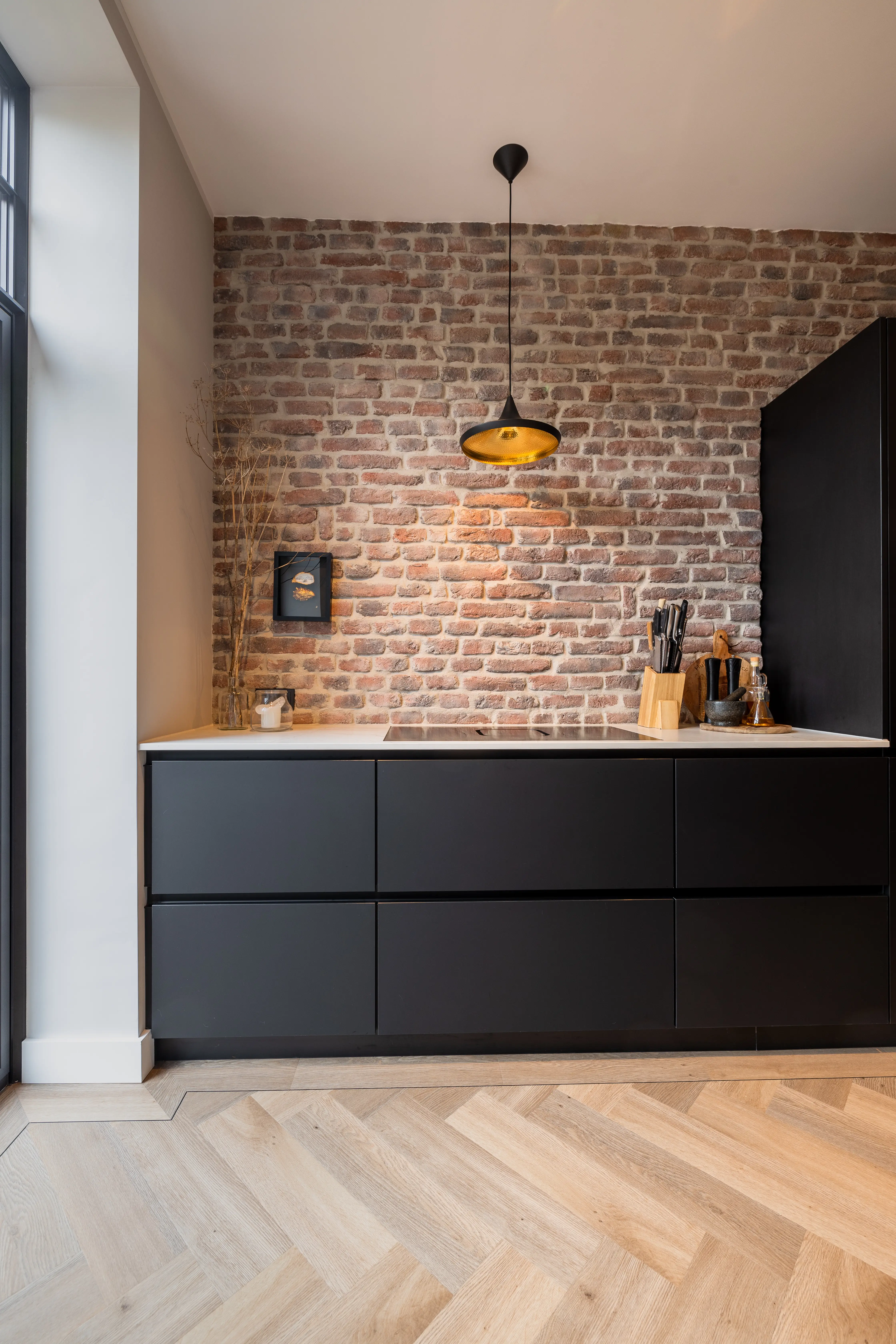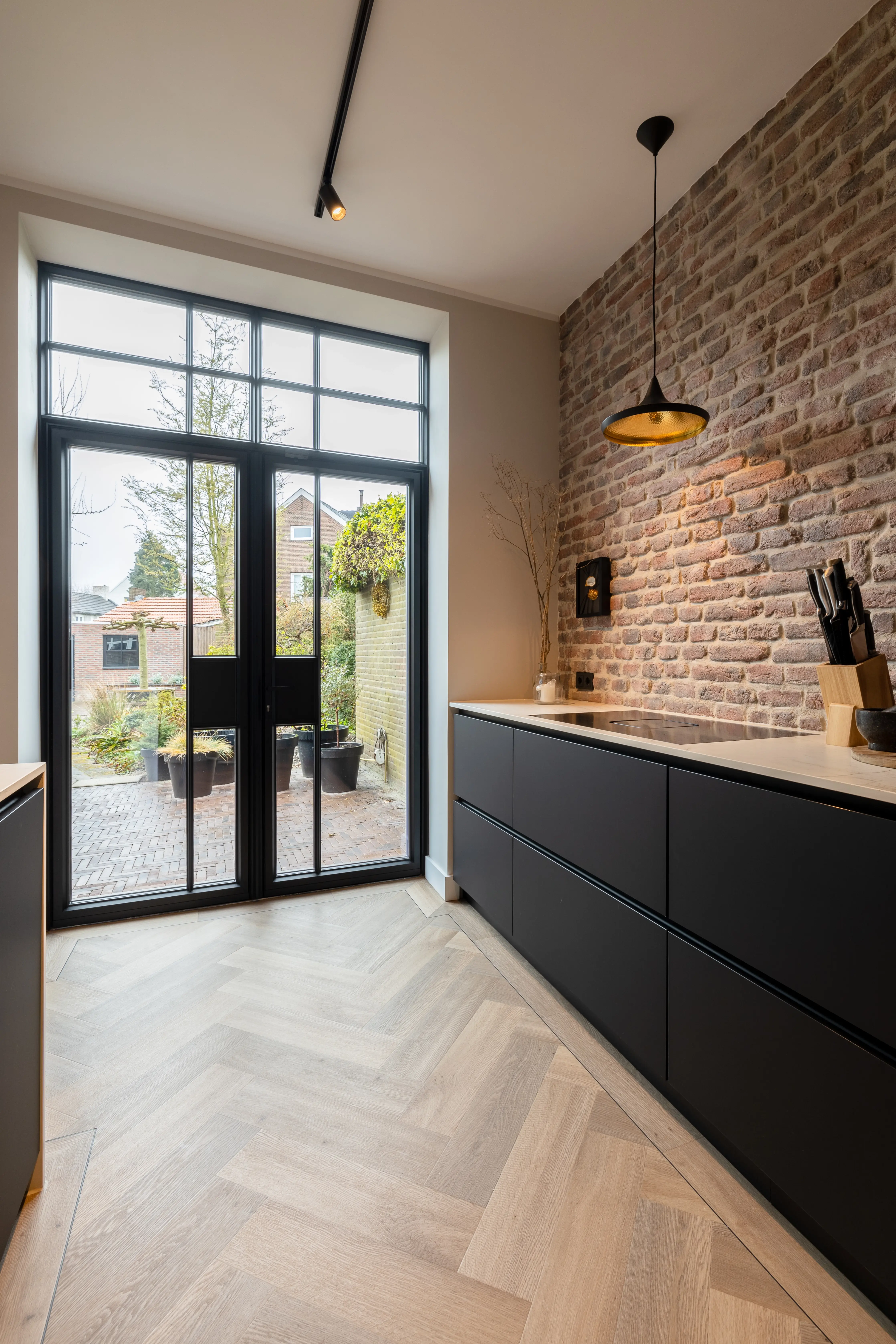 De keuken is het nieuwe middelpunt van de woning, met donkere materialen, een strak ontwerp en een opvallend drankrek boven het kookeiland. De kelderdeur werd slim weggewerkt in een kastenwand, en de openslaande deuren zorgen voor een naadloze verbinding tussen binnen en buiten, waarbij het originele kozijn behouden bleef.